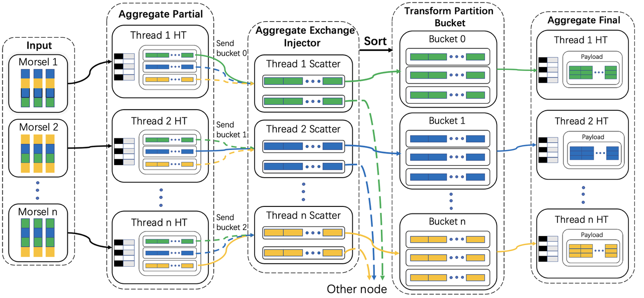 Due to varying radix bits in each thread-local hash table, in distributed scenarios, ensuring transform partition bucket operator can correctly perform streaming merging requires upstream data transmission to maintain an ordered state. In the Aggregate Partial stage, We have ensured that buckets are sent monotonically to downstream. At this point, in the Exchange Sorting operator, we implement a multi-way merge sort based on the monotonicity of the input. Specifically, we calculate a unique block number for each bucket according to a formula(