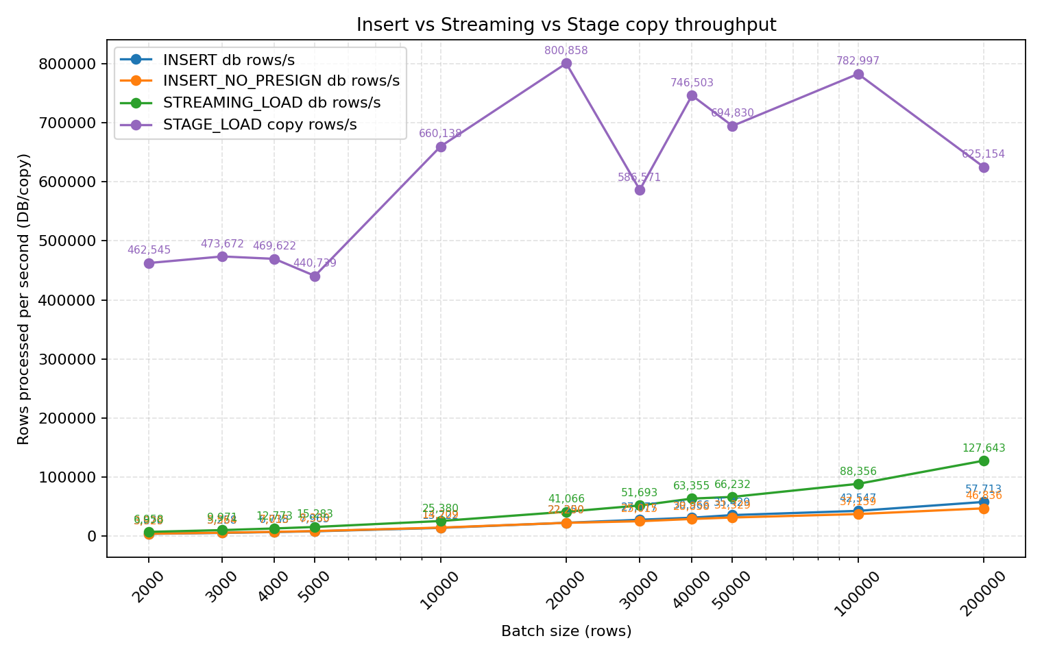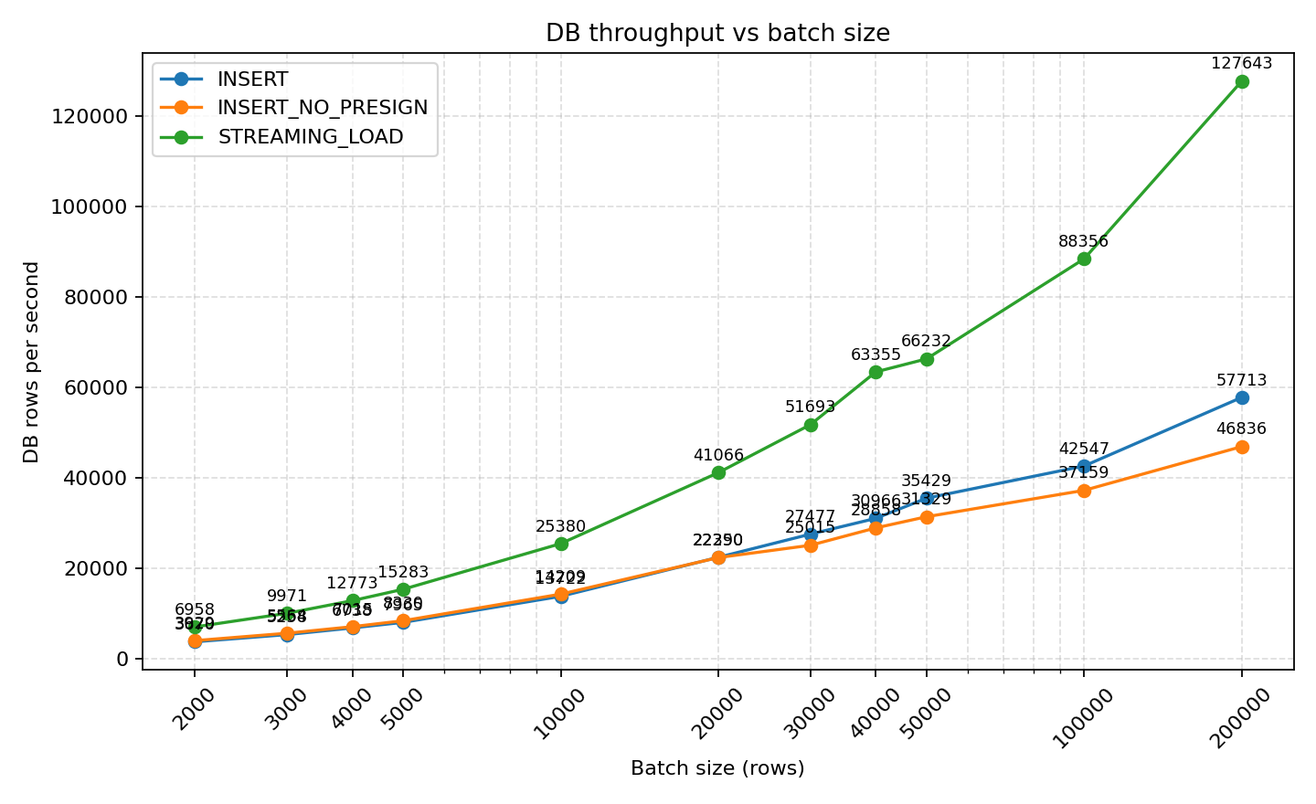 - STREAMING_LOAD's DB throughput rapidly improves with larger batches, from 6,958 rows/s with 2k batches to 127,643 rows/s with 200k batches, significantly outperforming INSERT (29,283 rows/s) and INSERT_NO_PRESIGN (26,121 rows/s) at the same batch sizes.