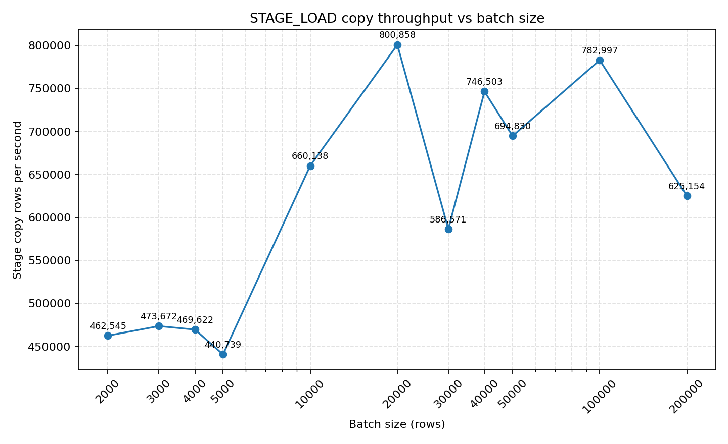 - STAGE_LOAD's COPY throughput is at a different magnitude: reaching 800k rows/s at batch=20k, stabilizing at 694k rows/s at 50k batches. Total time is more affected by stage writing + copy startup overhead, but single COPY throughput is unmatched.